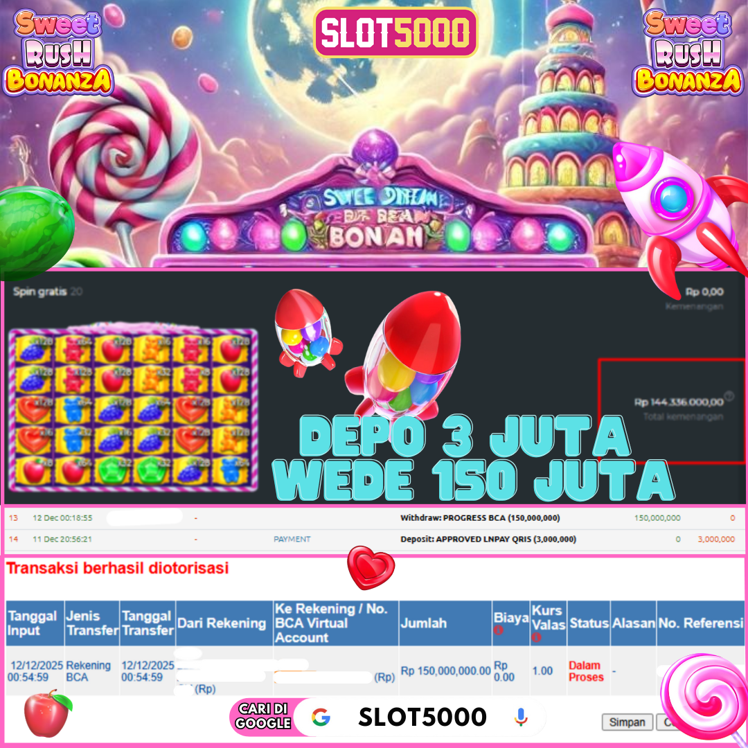 SLOT5000 merupakan bandar togel dan slot online yang membayar semua kemenangan member hingga lunas. Setiap pembayaran pada situs kami dilakukan dengan cara transfer ke rekening tujuan yang sudah di daftarkan pada situs togel online kami, Pembayaran hanya dapat di proses jika rekening yang di daftarkan telah valid dan dapat di transfer.  Semua kemenangan member yang mendapatkan hadiah jackpot terbesar akan kami posting agar semua pemain dapat melihat bandar situs terpercaya Slot5000 ini membayar semua kemenangan member hingga lunas. Setiap postingan yang kami posting akan kami lakukan sensor pada nomor rekening 4 digit dan nama rekening untuk menjaga privasi dan kerahasiaan member. Postingan Jackpot yang kami posting agar member atau pemain yang belum pernah bermain bisa melihat bandar togel Bukan Kaleng Kaleng Seperti Slot5000 ini, Semua postingan jackpot yang kami posting dapat di lihat data keasliannya melalui nomor reff yang di tunjukan pada bank atau mbanking saat kita melakukan transfer.