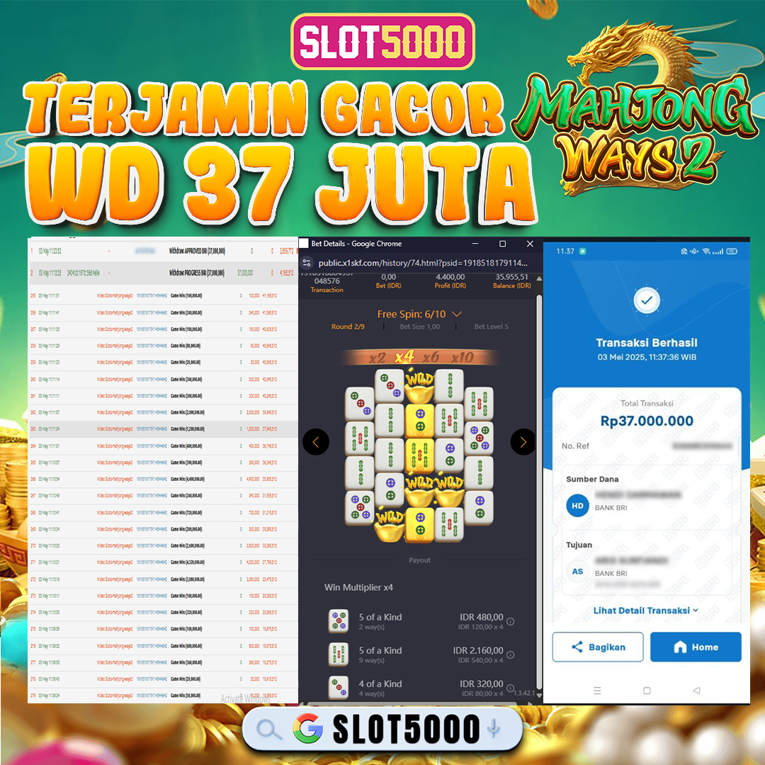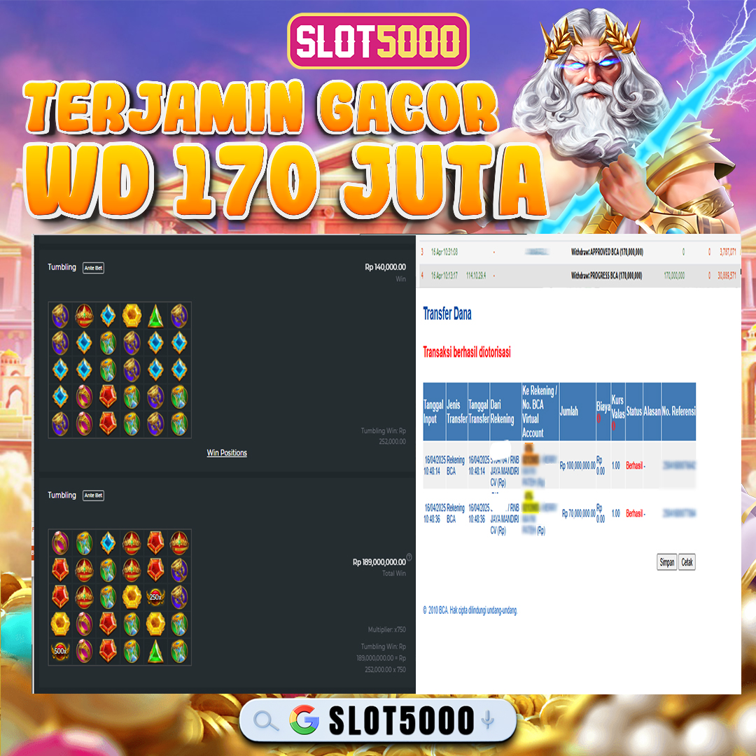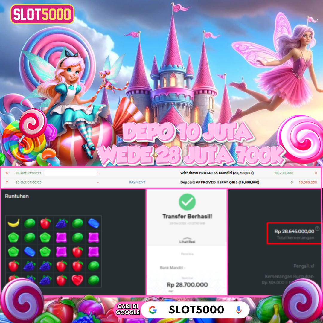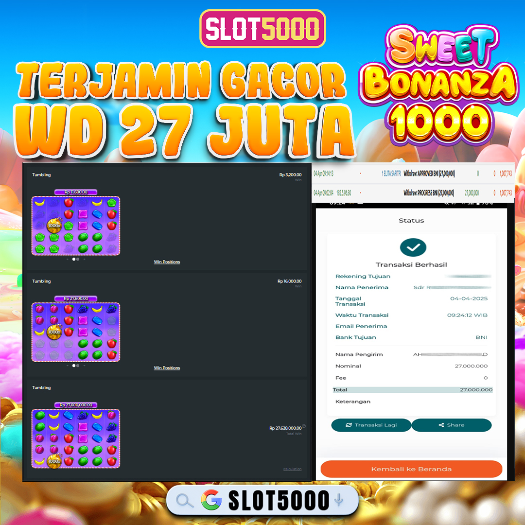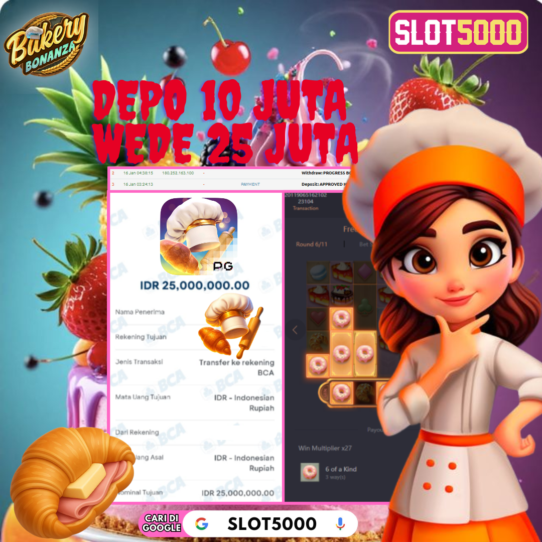 Selamat kepada User id : Diabl****05 Telah berhasil mendapatkan kemenangan besar pada permainan BAKERY BONANZA kemenangan Sebesar Rp.25.000.000, Setelah mengisi formulir withdraw dengan kurung waktu hanya 5 – 10 menit pihak SLOT5000 sudah melakukan transfer kepada pemilik User id dan dana sudah dapat di cairkan oleh pemenang. Bukti pembayaran yang kami berikan merupakan bukti pembayaran yang SAH / VALID yang langung di dapatkan melaui tanda transfer transaksi dari Bank yang di tuju.