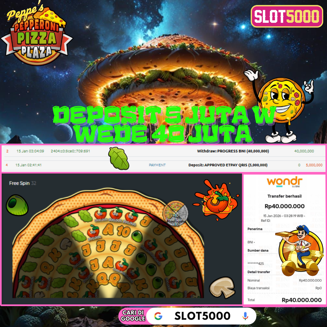 Selamat kepada User id : Herian***3 Telah berhasil mendapatkan kemenangan besar pada permainan PEPPERONI PIZZA PLAZA kemenangan Sebesar Rp.40.000.000, Setelah mengisi formulir withdraw dengan kurung waktu hanya 5 – 10 menit pihak SLOT5000 sudah melakukan transfer kepada pemilik User id dan dana sudah dapat di cairkan oleh pemenang. Bukti pembayaran yang kami berikan merupakan bukti pembayaran yang SAH / VALID yang langung di dapatkan melaui tanda transfer transaksi dari Bank yang di tuju.
