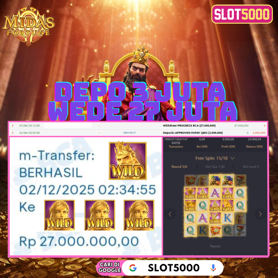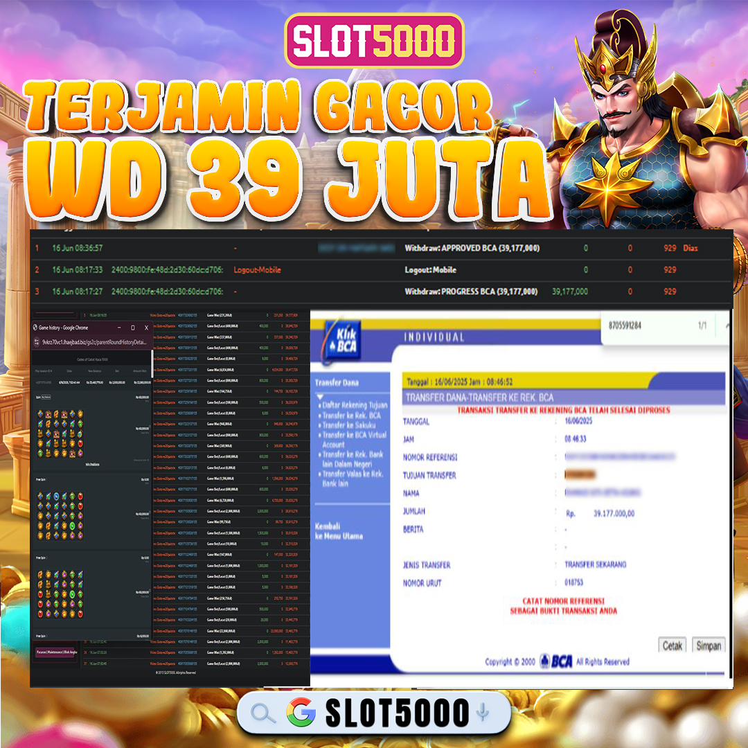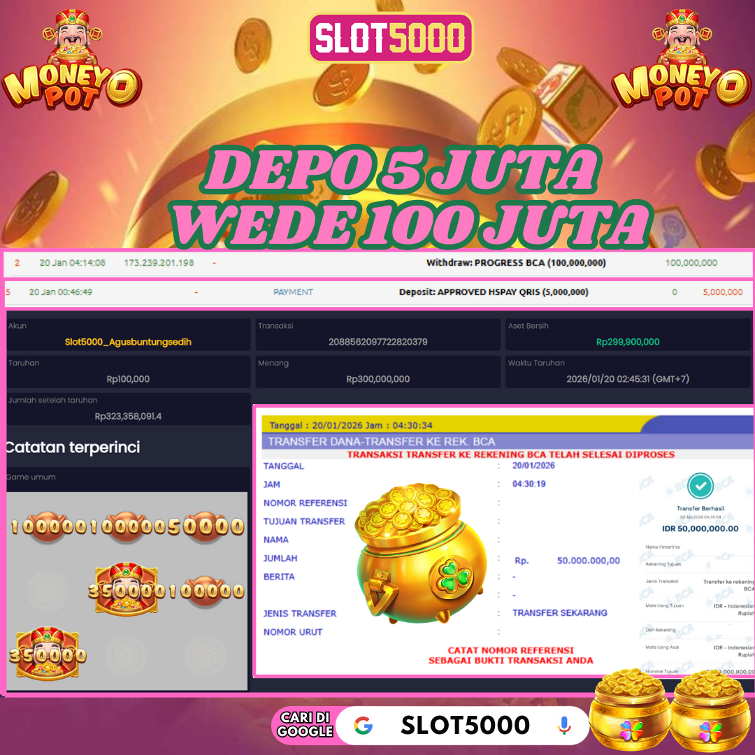 Selamat kepada User id : Agusbunt****dih Telah berhasil mendapatkan kemenangan besar pada permainan JILI GAMING – MONEY POT kemenangan Sebesar Rp.100.000.000, Setelah mengisi formulir withdraw dengan kurung waktu hanya 5 – 10 menit pihak SLOT5000 sudah melakukan transfer kepada pemilik User id dan dana sudah dapat di cairkan oleh pemenang. Bukti pembayaran yang kami berikan merupakan bukti pembayaran yang SAH / VALID yang langung di dapatkan melaui tanda transfer transaksi dari Bank yang di tuju.