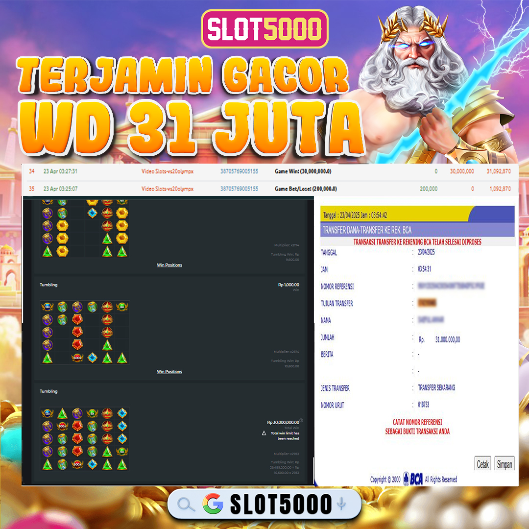 SLOT5000 merupakan bandar togel dan slot online yang membayar semua kemenangan member hingga lunas. Setiap pembayaran pada situs kami dilakukan dengan cara transfer ke rekening tujuan yang sudah di daftarkan pada situs togel online kami, Pembayaran hanya dapat di proses jika rekening yang di daftarkan telah valid dan dapat di transfer. Semua kemenangan member yang mendapatkan hadiah jackpot terbesar akan kami posting agar semua pemain dapat melihat bandar situs terpercaya Slot5000 ini membayar semua kemenangan member hingga lunas. Setiap postingan yang kami posting akan kami lakukan sensor pada nomor rekening 4 digit dan nama rekening untuk menjaga privasi dan kerahasiaan member. Postingan Jackpot yang kami posting agar member atau pemain yang belum pernah bermain bisa melihat bandar togel Bukan Kaleng Kaleng Seperti Slot5000 ini, Semua postingan jackpot yang kami posting dapat di lihat data keasliannya melalui nomor reff yang di tunjukan pada bank atau mbanking saat kita melakukan transfer.